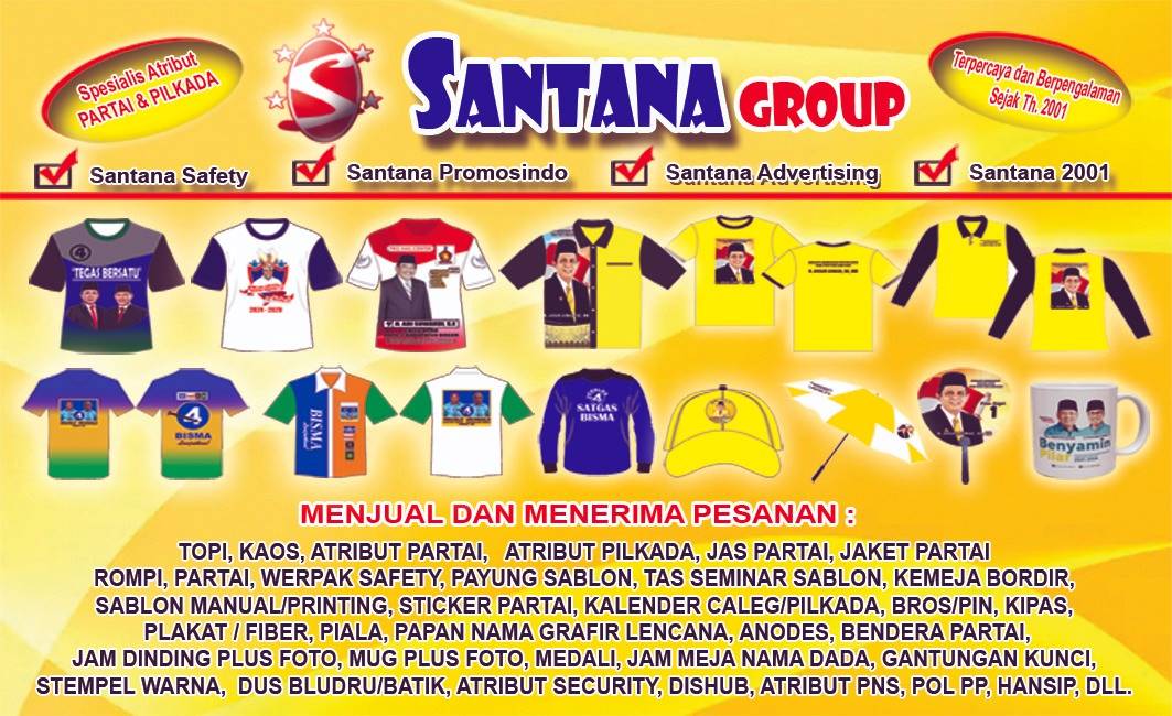 Santana Promosindo adalah Solusi bagi kebutuhan Promosi Bisnis Anda. Melayani dengan handal dan sesuai dengan keinginan Anda. Percayakanlah pada ahlinya. karena Kami sudah berdiri dan Terpercaya Sejak Tahun 2001.